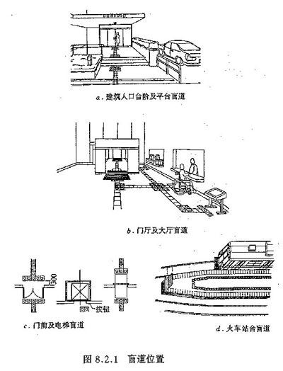 8.2.1 政府机关与主要公共建筑的人行通道应设盲道;在建筑入口、服务台、楼梯、电梯、公共厕所或专用厕所、火车与地铁站台等无障碍设施的位置应设提示盲道(图8.2.1)。