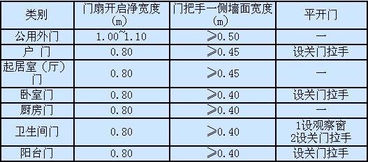 2 门扇开启最小净宽度及门把手一侧墙面的最小宽度应符合表7.12.6的规定;