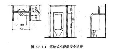3 扶手末端应向内拐到墙面,或向下延伸0.10 m。栏杆式扶手应向下成弧形或延伸到地面上固定(图7.6.1-2);