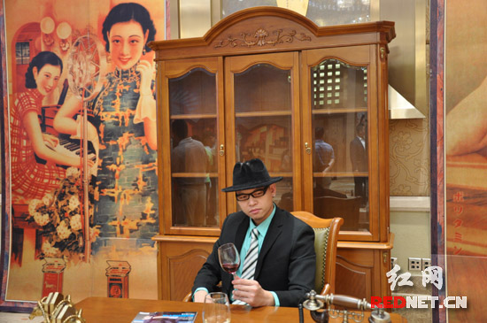 旧家具,红酒,身穿老上海服饰的青年,给人一种身临其境的感觉。