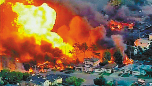 美联社援引目击者的话报道,威力巨大的爆炸把一个火球冲向300多米高空。借助风势,大火很快吞噬附近民宅,熊熊燃烧的火焰高达10多米。