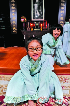 据介绍,孔圣堂少儿儒学班系公益性质,将秉承孔子的教育思想和传统的教育模式,融合诗教、礼教、乐教,注重人格培育、德行教育和综合素质的培养,孩子们将在这里诵读经典,修习中华武术,还将学习古筝、古琴、笛子等音律课程,其教材、服装及学费均由社会爱心人士和企业赞助。