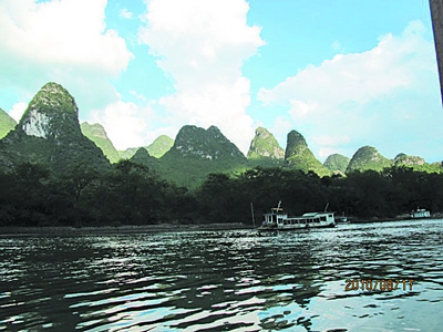 漓江:出冠岩景区左拐三四百米,就有一个码头,从这可坐船游览漓江。不过,最浪漫的是租条竹排,泛舟漓江。一路前行,漓江像条蜿蜒的玉带,缠绕在苍翠的奇峰中,山峰倒影,几分朦胧,几分清晰。天公也似乎特别钟情于这片山水,一会儿阳光普照,一会儿又洒甘霖,让本来美不胜收的漓江更添一份娇羞,一份妩媚,一份神秘。难怪世上那么多人会为这方山水沉醉。