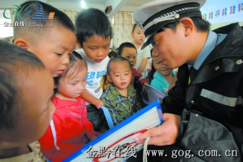 娃娃学交规 贵州教育报 《贵州都市报》官方账号 2010.09.1309:07 关注 9月10日,贵阳市第五幼儿园里,交警姚富文正在教孩子们认识交通标志。当天,贵阳市交警一大队民警来到市第五幼儿园,开展“小手牵大手,警幼携手建和谐校园”活动;民警向小朋友们讲解一些常见的交通标志和常识,希望他们回到家中能带动家人主动遵守交通法规,文明、安全参与交通。