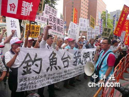 人民网9月14日电 据中评社报道,两岸和平发展论坛与中华保钓协会等团体今天上午号召百余人赴日本在台交流协会抗议,他们喊口号要求日本政府“道歉、放人、赔偿”,并且当场焚烧日本国旗,丢鱼泄恨。