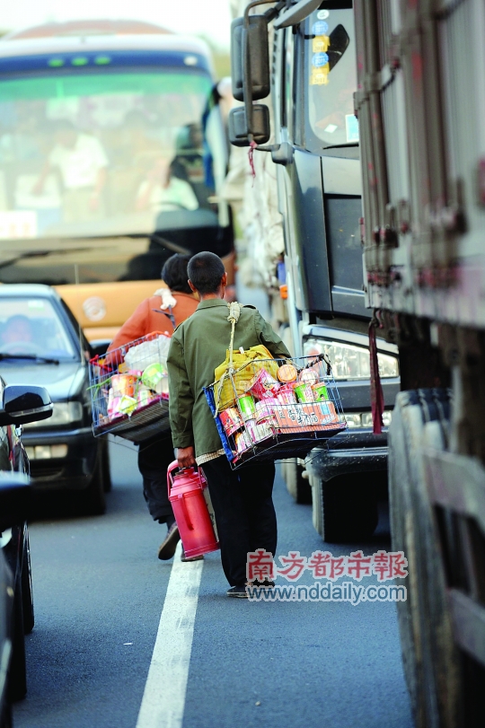 | 高速公路附近村民向堵在路上的司机兜售食品,这也成为他们主要的生活来源。 |