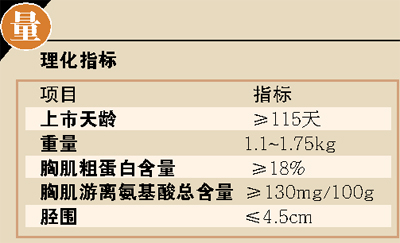 不仅如此,标准还对鸡的上市天龄、重量、胸肌粗蛋白含量、胸肌游离氨基酸总含量、胫围都有要求。重量要求在1.1~1.75kg之间,上市天龄不小于115天,胫围(小腿围)不大于4.5cm。