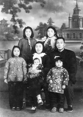 1946年全家相摄于桂林,妈妈(后排左2)爸爸(后排左3)大姐(后排右1)二姐(后排左1)大哥(后右2)我(前右1)。次年,爸爸即带我们回长沙,协助姨父谭云山创办长沙大同学校。胡玲玲供照