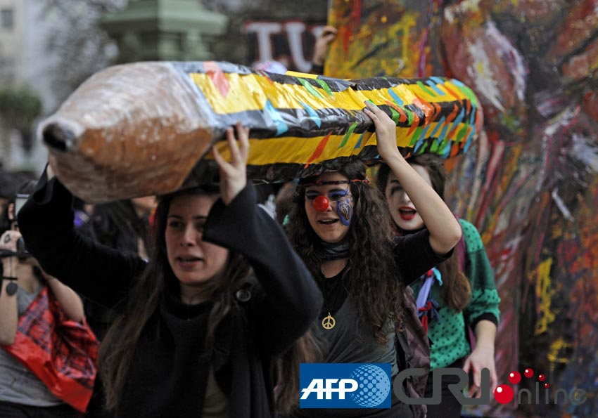 三名艺术系学生举着一根巨型铅笔,沿着著名的五月大道和教师们一起举行示威游行,他们要求政府为教育预算增资。图片来源:(AFP/国际在线)