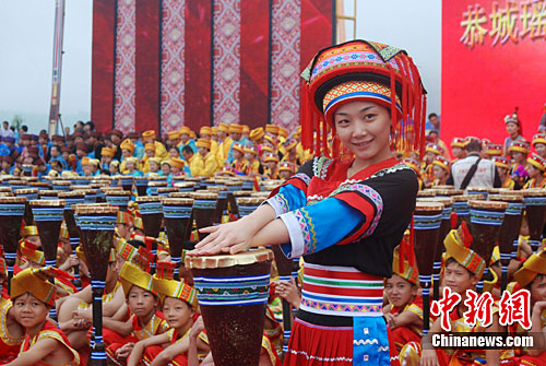 中新网桂林9月25日电 (记者 周利朔)广西桂林市恭城瑶族自治县25日举行隆重集会,数万名瑶族民众穿着鲜艳的民族服装,载歌载舞,庆祝瑶族自治县成立20周年。