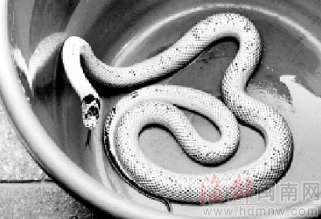 昨日上午,记者在东方名城看到,白蛇被装在一个塑料桶内,不时沿着桶壁攀爬,但桶比较高,它没法出来。蛇身发白,鳞片边沿呈黑色,蛇头也有“黑斑”。小王的一名同事说,小区背靠着山,偶尔有蛇闯进来,他碰到过三五回,大多出现在小区绿化带上,“但以前看到的蛇大多呈深绿色,白色的蛇还是头一回遇到”。小王则说,不知道这蛇是不是稀有品种。