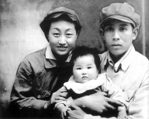 又过了10年,两人的穿着大为改变:齐刘海的卷发和西装革履不见了,取而代之的,是中国人民解放军军装。不过,夫妻俩中间多了个睁着大眼睛的小女孩,脖子上系着浅色的围嘴。