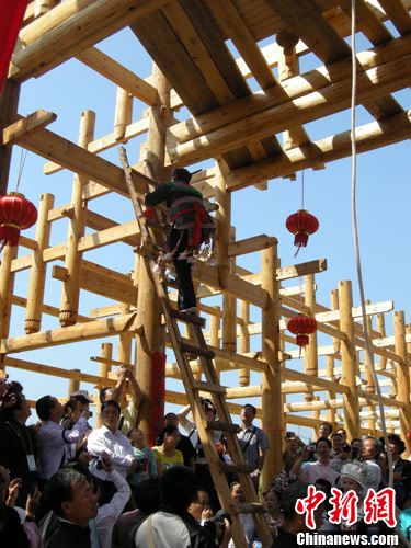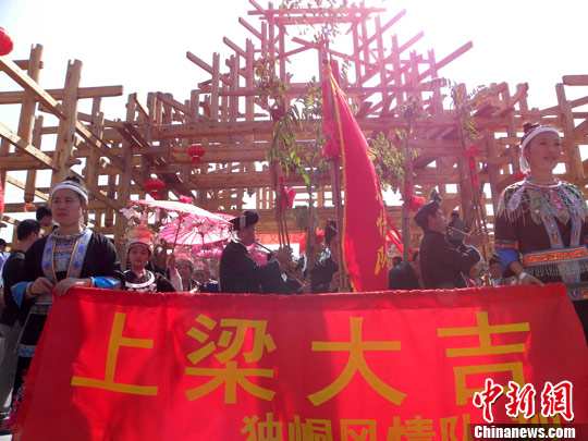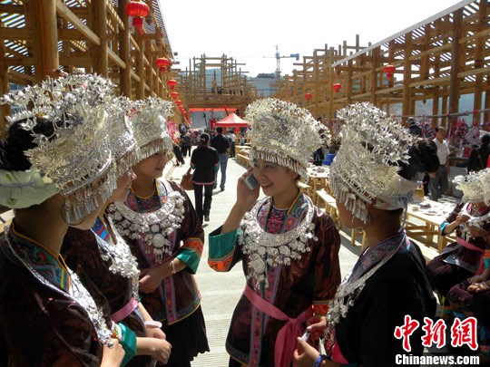 10月3日,全长368米的广西三江风雨桥在三江侗族自治县举行了古老而神秘的上梁仪式。图为侗乡少女将三江风雨桥上梁仪式的喜讯传递给亲朋好友。中新社发 何斌 摄