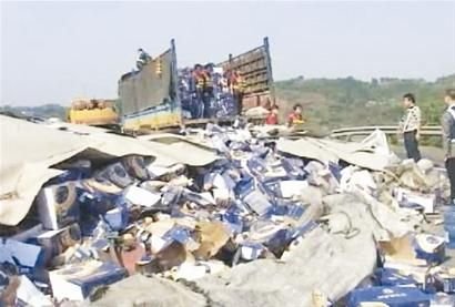 一位民警介绍,当时高速公路中间一道近五十米的隔离栏已被完全撞飞,长约二十米的红色大型平板挂车,车身前后部分完全分离,车头全部烧焦,只剩下轮胎等一些零部件,挂车装载的数千箱饮料全部倾泻在道路上。