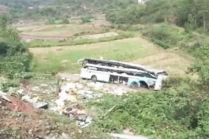 大家十分惊恐,很多人吓得大叫起来。还没等大家反应过来,紧接着另一边一辆客车忽然撞向路边的护栏,冲出公路,冲下30多米深的坡底,一时间,哭喊声一片。