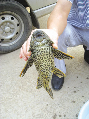 昨天上午,家住南京下关的市民孟先生给本报打来电话称,他从长江里抓到了一条怪鱼,浑身长刺,奇怪的是鱼小嘴巴长在肚子下方,身上带有斑点。为此,他还特地开着面包车,沿着长江边询问多个江边的老渔人,结果没有一人能识此鱼。不过,昨天记者请教了一名做水产的专家,他告诉记者,这应该是一条名叫“清道夫”的鱼,是淡水鱼的杀手。
