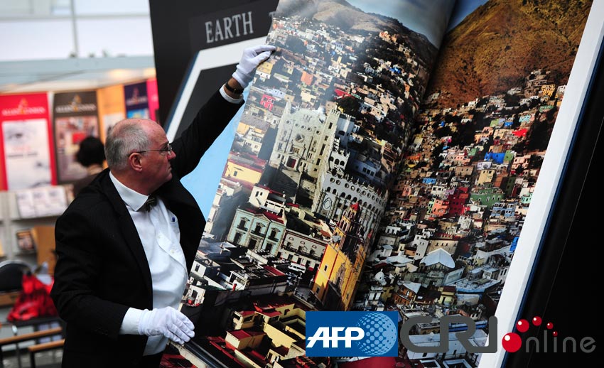 这本地图册被称为“世界上最大的书”,这本巨大的书有两米高,三米宽。图片来源:(AFP/国际在线)
