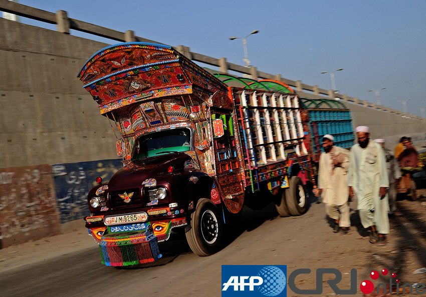 国际在线专稿:据法新社报道,用精美的彩色图案装饰卡车是巴基斯坦的独特传统,源自旧时贵族乘坐的彩绘马车。在如今的巴基斯坦,各地都有不同的卡车彩绘风格,有些装饰则寄托了长途司机的思乡之情。尽管巴基斯坦常被看作一个经济落后的国家,这里的人们每年要在卡车装饰上花费大量金钱。图片来源:(AFP/国际在线)