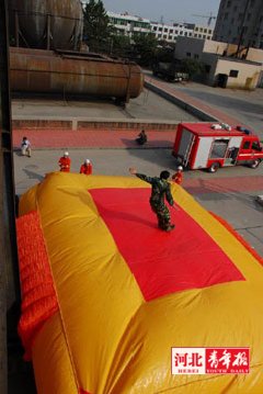 日前,正定消防在进行消防演习时,除了灭火、救人外,还演示了如何正确跳到气垫上逃生。消防人员介绍,在火灾现场营救被困人员时,让被困人员往气垫上跳是一种有效的营救方式,尤其在10米以下跳气垫是安全的。但很多被困人员缺乏跳气垫的技巧,在跳气垫时可能会意外受伤。