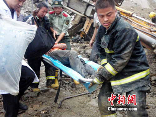 10日15时40分,消防队员到达事发现场,由于工地上路面非常泥泞,消防车无法通行,消防队员只好手抬破拆工具跑步前往事发地点。到达现场后发现,一辆大型工程挖掘机侧翻在山腰,驾驶室已经完全变形,司机成v字型卡在驾驶室内,左手和右脚均被驾驶室内的保险杠和座椅夹住,周围被石块包围,头部和四肢有出血现象。