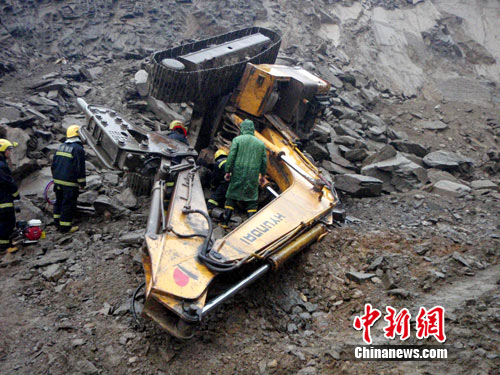 江西一工地发生山体滑坡 挖掘机跌落山腰司机被困