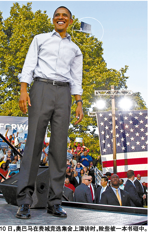 奥巴马竞选演讲时险被人扔书击中(组图)