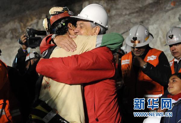 10月12日,在智利圣何塞铜矿,智利总统皮涅拉(前右)与第一位顺利抵达地面的被困矿工弗洛伦西奥·阿瓦洛斯·席尔瓦拥抱。圣何塞铜矿被困矿工最后阶段的救援工作于当地时间12日晚开始。新华社发(智利政府提供)