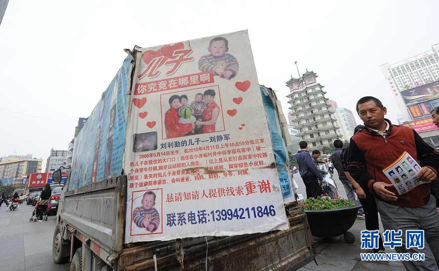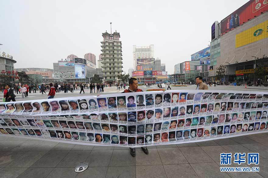 当日,来自山西省太原市的冯建林驾驶着一辆贴满一个个失踪孩子照片的小货车来到郑州二七广场,希望热心人能提供线索,帮助找回自己和另外2000多个家庭失踪的孩子。冯建林还将失踪孩子的照片和信息制作成条幅,让更多人关注。自从女儿在2008年走失后,为了找到她,冯建林辞掉了工作,开着自己的小货车奔波在全国多个城市寻找线索,后来他成为“宝贝回家志愿者协会”的一名志愿者,在找寻女儿的同时帮助更多人寻找失踪的孩子。新华社记者 赵鹏 摄