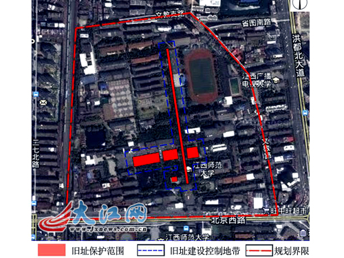 据江西师范大学校长傅修延介绍,修复旧址外观工作从今年的7月开始,将于本月25日前完成。旧址的保护范围划定为:东至王字楼前飞机跑道,西至棚厂,南至指挥塔楼,北至飞机制造厂大棚车间,东西宽约112米,南北长约328米,总面积为1.3公顷。建设控制地带范围划定为东至王字楼西5米,西至棚厂以西10米,南至指挥塔楼以南10米,北至棚厂以北10米,东西宽约132米,南北长约348米,总面积为2.24公顷。