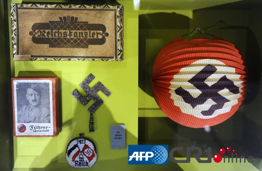 展览中再现了一战和二战时期的纳粹党徽、灯笼、纳粹宣传卡和壁画等物品。图片来源:(AFP/国际在线)