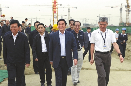 期建设工地参观,158万平方米厂房建设全面展开,工地上机器轰鸣,近百台塔吊正在忙碌施工,一万多名建设工人正在奋力加快项目建设步伐,一张张按周、按天量化任务的施工进度表生动记录了富士康成都项目建设的“世界速度”。企业负责人说,“我们每周都和四川、成都有关方面召开协调会,双方充分理解、密切配合,工作进度精确到天甚至小时。”刘奇葆说,加强沟通,通力合作,这是富士康成都项目建设速度创造纪录的成功经验,地方政府和相关部门要继续做好项目服务工作,为企业生产、员工生活创造更好的条件。