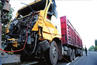 马路对面停着一辆重型半挂货车,几名工人正在修理,货车前脸已被撞烂,玻璃碎裂。据前来拖车的人员称,货车司机已被警方带走,货车和小公交车将拉往顺义杨镇暂时安放。