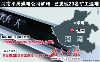 南方日报综合消息据新华社报道,10月16日清晨6时左右,河南省禹州市平禹煤电公司四矿发生瓦斯突出事故,造成20名矿工遇难,井下尚有17人被困生死未卜。国务院总理温家宝、副总理张德江为此专门作出批示,要求全力以赴做好救援工作。