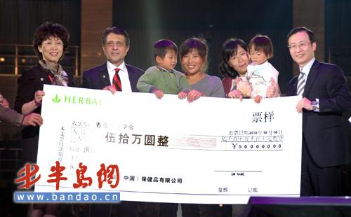 半岛网10月17日消息 10月16日晚国际知名保健品公司康宝莱在青岛国信体育馆举行慈善晚会。康宝莱中国区总裁李延亮先生亲手将50万元的支票牌递到青岛市红十字会常务副会长李然女士手中。这笔善款将通过红十字会定向捐助两个山东的听力残障孩子:崔佳鑫和李可馨,帮助她们进行人工耳蜗手术,告别无声世界。