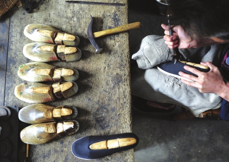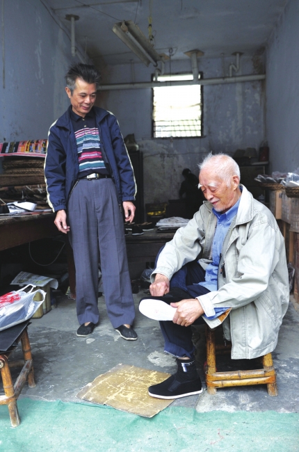 右边的房间里有两张很大的木质工作台,老式剪子、锥子……旁边是个2米高的木架,上面堆放着几百件鞋楦头,大小不同、肥瘦不一,这些年代久远的东西都是黄先德师傅的宝贝。黄先德是鞋厂的骨干,制作鞋楦的高手,多次为党和国家领导人量身定制过布鞋。到年底,他就退休了,此时他却很郁闷,因为没有接班人。“一双布鞋才卖35元,费时费工不说,还挣不到钱,年轻人都不愿意来。”