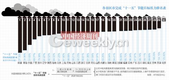 在此之前,《中国经济周刊》研究部根据国家统计局、国家发改委公布的数据,综合各省区市“十一五”规划制定的节能指标、各省区市“十一五”前四年单位GDP能耗累计下降率以及2010年上半年各省区市能耗下降率,计算出了“各省区市完成‘十一五’节能目标压力排名表”,节能目标完成进度数值越小压力越大(截至2010年6月底,见“各省区市完成‘十一五’节能目标压力排名表”),按照由大到小的压力顺序依次为:新疆、青海、宁夏、广西、贵州、辽宁、陕西、海南、江苏、上海、河南、山东、江西、浙江、甘肃、河北、山西、内蒙古、湖南、黑龙江、安徽、福建、云南、广东、四川、湖北、重庆、吉林、天津、北京。