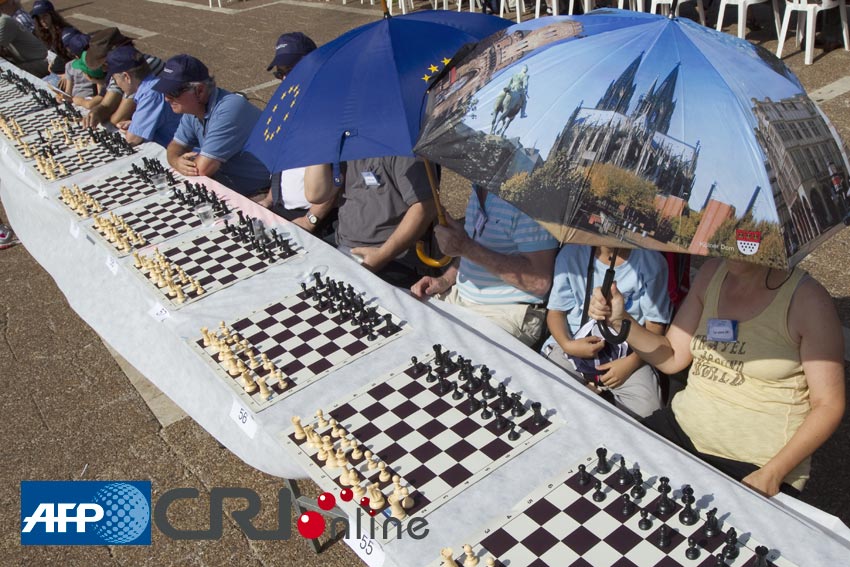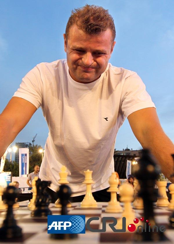 当天阿利克身着白色T恤依次在数百张棋桌间活动。图片来源:(AFP/国际在线)