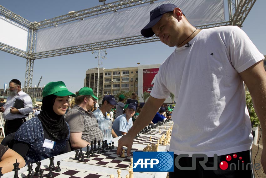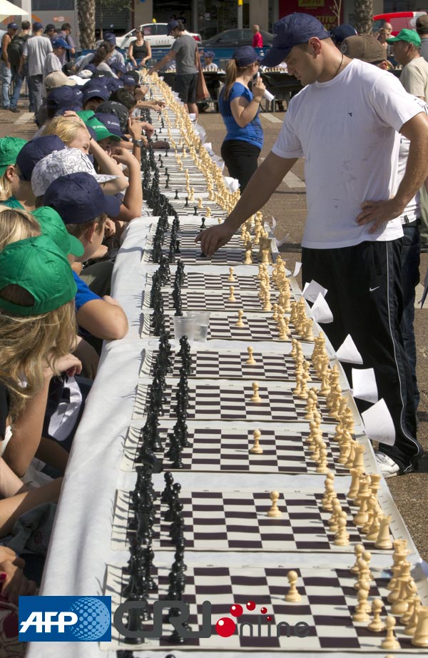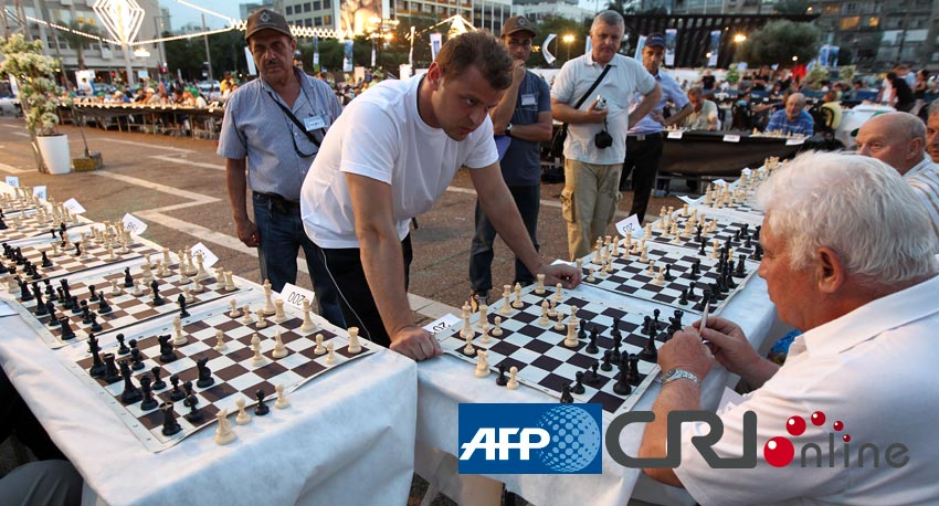 以色列国际象棋大师阿利克在首都特拉维夫同时与525名当地棋手对弈。图片来源:(AFP/国际在线)