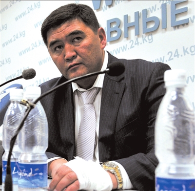 23日,塔希耶夫在一群保镖簇拥下在首都比什凯克中部召开新闻发布会。他一只手包着绷带,几根手指上血迹已干。