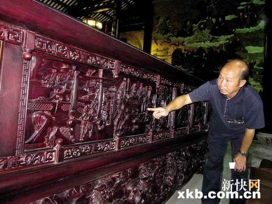四是近6米长的木雕贡案。这是用整块高棉花梨木制成的,重达3吨多。