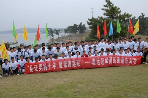 当天上午,在岱山湖景区,数百名通过媒体报名的志愿者、合肥九龙泌尿专科医院的医护人员和田亮一起参与了"田亮领跑岱山湖环湖健康跑"公益活动。11:00,随着发令枪响,在奥运冠军田亮的领跑下,人们身着统一的服装,在岱山湖畔慢跑,以此共同体会和宣传男性健康的生活方式和理念。不少游客纷纷举起相机,记录下这个时刻。活动中,许多志愿者和游客和田亮合影留念。