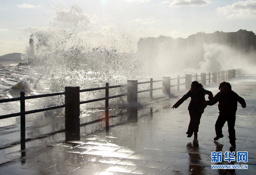 10月25日,在山东威海海滨,两名行人躲避迎面扑来的浪花。当日,受强冷空气影响,山东威海海上风力达8至9级,阵风风力达到11级,海滨大浪排空,威海市海上搜救中心发布海上风险黄色预警。新华社发(于启波 摄)