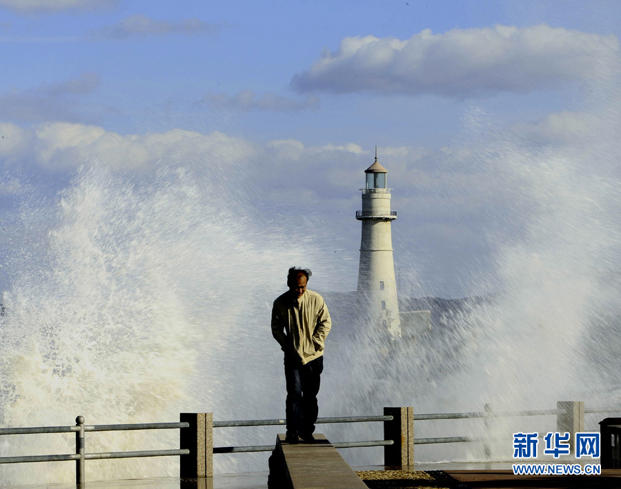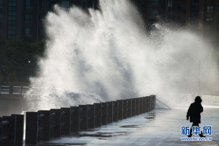 10月25日,一名行人从山东威海海滨掀起的浪花旁走过。当日,受强冷空气影响,山东威海海上风力达8至9级,阵风风力达到11级,海滨大浪排空,威海市海上搜救中心发布海上风险黄色预警。新华社发(于启波 摄)