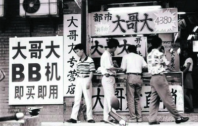手提电话初期被称作“大哥大”,上世纪90年代初,有钱有身份的人才用得起“大哥大”。到90年代中后期,其身价很快就掉下来了,市场促销很火爆,这是1996年长沙街头某销售店的促销场景。黎泽重 供照