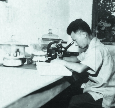 1962年7月,在衡阳汽车配件厂工作的彭毅用金相显微镜检查产品质量。彭毅供照