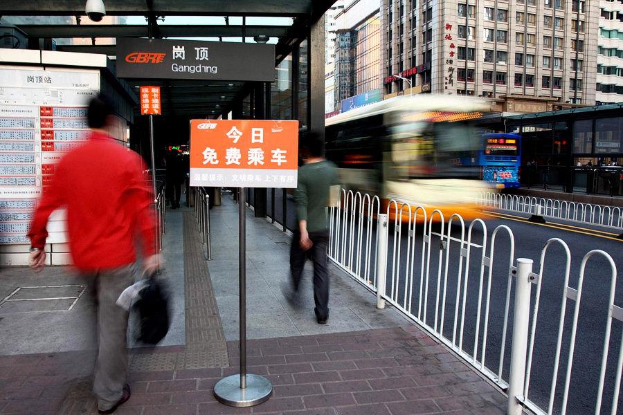 11月1日,下午5点半,广州BRT公交岗顶站,一块醒目的提示牌写着“今日乘车免费”。