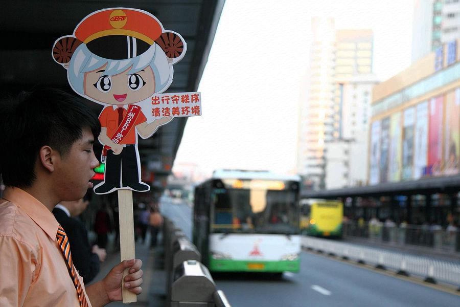 11月1日,一名BRT站台上的工作人员打出告示牌,指导顾客上车。