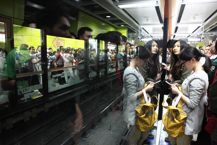 11月1日,图为广州地铁岗顶站,人潮汹涌。