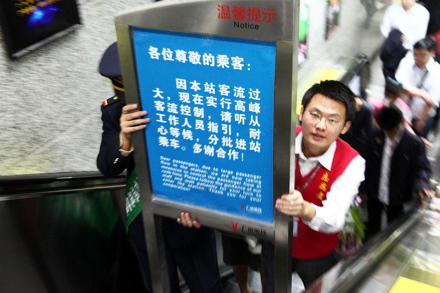 11月1日,图为下午5点40分许,广州地铁岗顶站,志愿者将“高峰控制告示牌”运到站台入口,准备迎接客流高峰的到来。