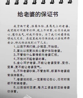 好赌老公写下八条保证 请求出走老婆尽快回家